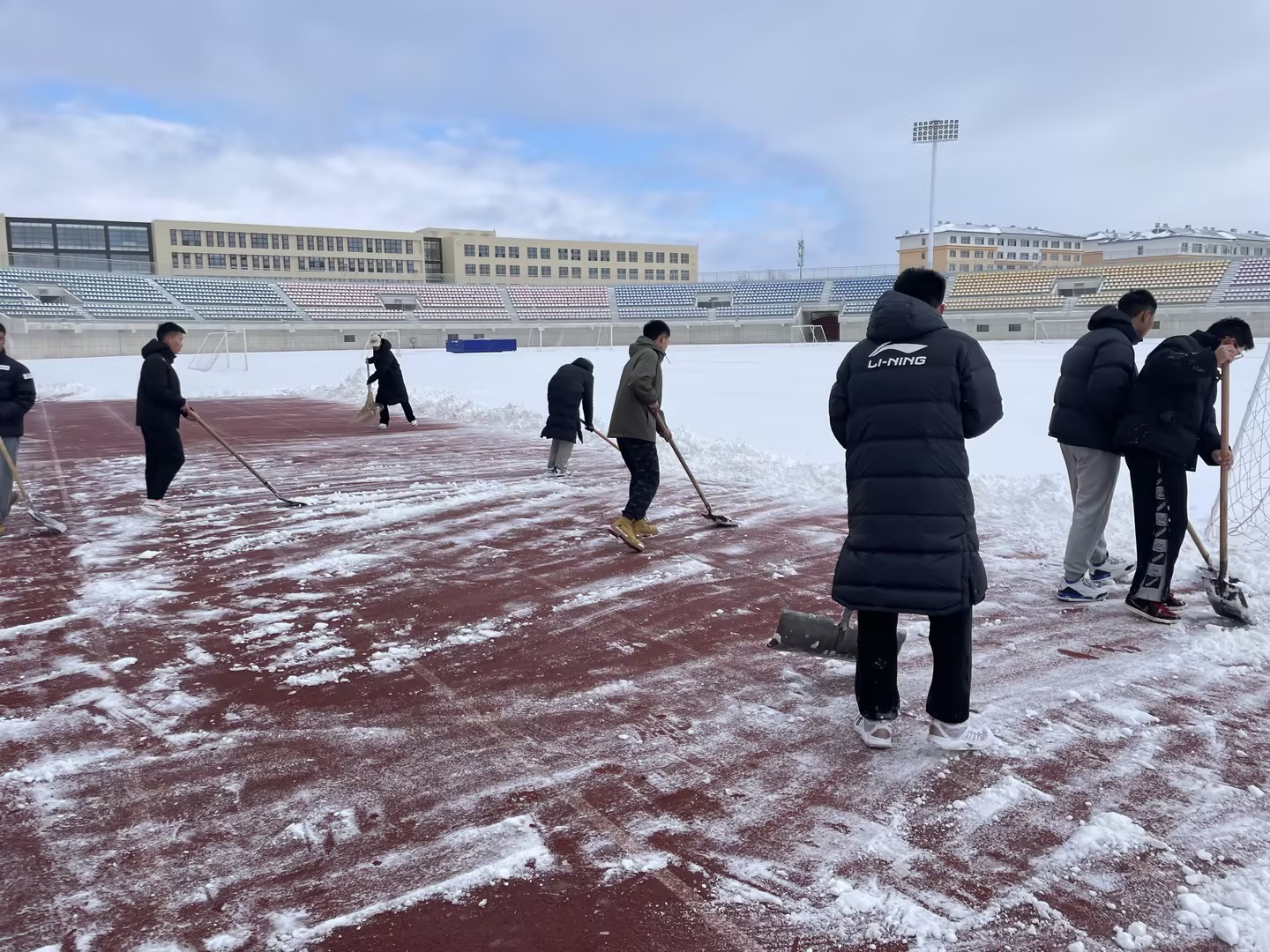 为进一步落实习近平新时代中国特色社会主义思想,推动劳动教育融入到员工学习生活,老师同学们克服寒冷天气,积极主动地加入到扫雪活动中。由于是第一场雪,冰雪融化不定紧紧附着在地面上,加剧了清扫的难度,但这丝毫没有影响同学们的热情和工作效率,他们利用铁锨、扫把等工具,相互配合、一鼓作气将田径场的积雪按计划全部清扫干净。同学们用自己最朴实的行动诠释着劳动是责任是义务。劳动的过程充满欢声笑语,大家乐在其中。洁白的雪花映照着同学们红彤彤的脸庞,扫雪队伍成了冬日校园里一道靓丽的风景线。