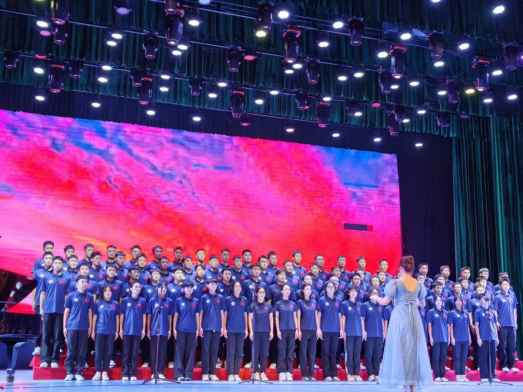 参与人员由75名员工与6名老师组成,一亮相便展现出独特风采。师生们身姿矫健、昂首挺胸,身着统一的运动装,胸前的五星红旗熠熠生辉,彰显着体育人特有的蓬勃朝气与昂扬斗志。随着指挥老师稳健有力地抬起双手,他们为大家带来了《早安,中国》和《我的中国心》两首歌曲,同学们的声音紧密配合,用铿锵节奏强化情感表达,每一个音符都掷地有声,声调平稳宛如汹涌澎湃的暗流,持续输出雄浑力量,夯实整首歌的底蕴。歌曲结束,台下立刻传来了热烈的掌声。