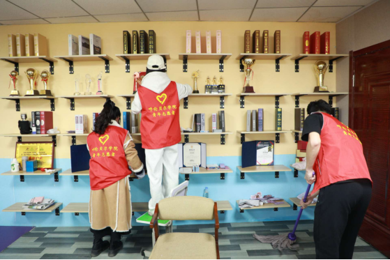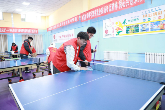 在活动中,大家身着统一红色服装,到达活动现场后,同学们热情高涨,迅速分工,投入到紧张而有序的服务工作中。同学们拿起扫帚、拖把和抹布,认真清理地面上的灰尘与污渍,细心擦拭乒乓球桌、座椅和器材,每一个角落都不放过,汗水浸湿了他们的额头,却浇不灭大家心中志愿服务的热忱。