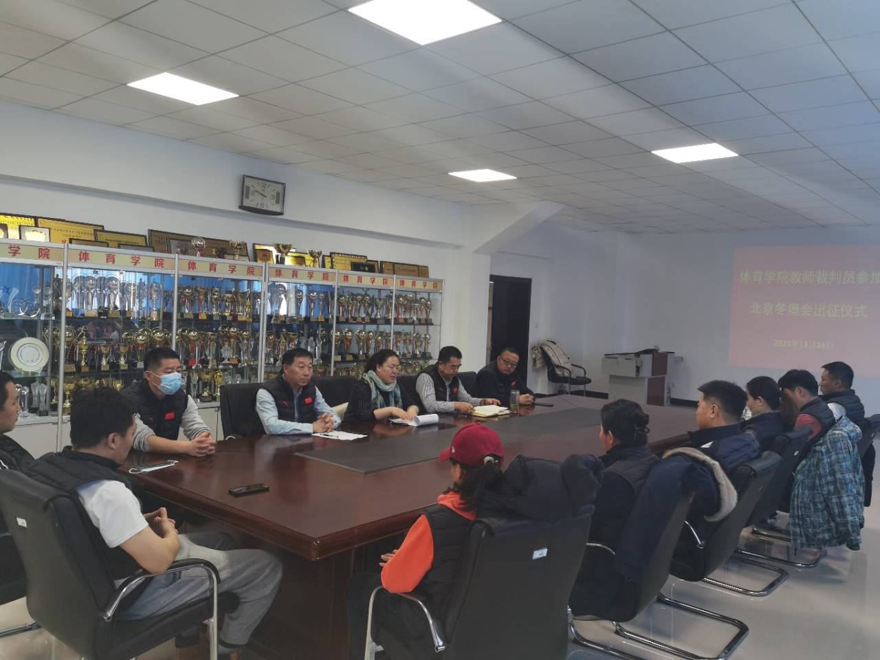 2022年1月9日,在必一运动东山体育场会议室为即将要参加北京冬奥会、冬残奥会的12名裁判员举行出征仪式,公司领导班子、环节干部和所有裁判员参加了此次活动。