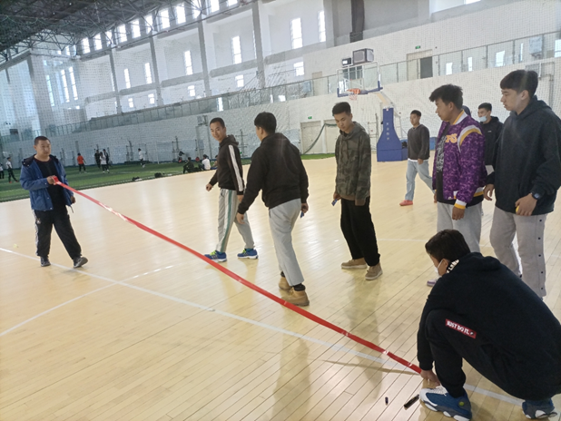 教师志愿者郭晨、张大伟、秦智勇等老师正在进行室内场馆贴线更换。
