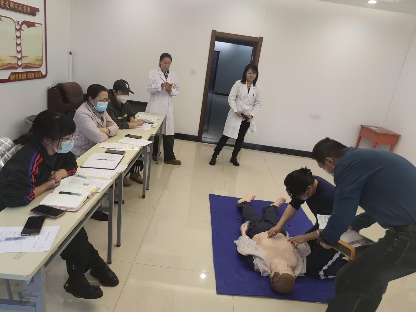 培训活动最后环节,两位大夫配合讲解和示范了“海姆立克”急救法的具体操作步骤和注意事项。还将以上所学的应急救护技能,对5位教师进行了理论知识考试。