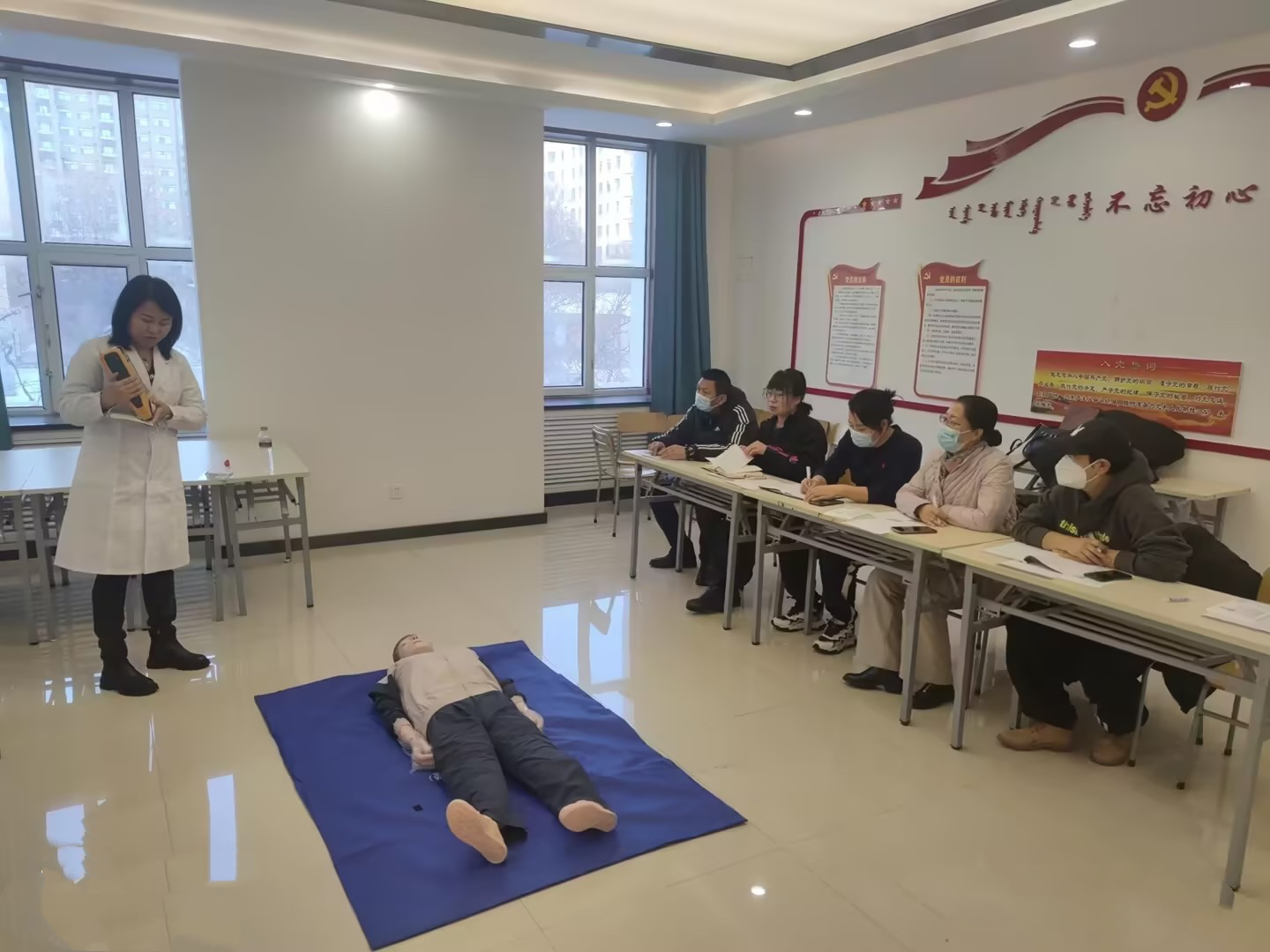 培训活动将理论讲解和实际操作相结合。首先校医院负责人王大夫对除颤仪的理论知识进行科普讲解,除颤仪是用于紧急抢救心脏骤停患者的一种现场急救医疗设备,可对心跳骤停患者进行紧急除颤和心肺复苏。王大夫重点强调徒手心肺复苏的方法和技巧及正确使用除颤仪,包括适用场景、操作步骤和注意事项等。随后龚大夫借助模拟人,现场演示了心肺复苏和除颤仪的操作流程,从环境评估到胸外按压,从手法要求到时间控制,从一看二听三感受到除颤仪的操作,全方位对实践操作要领进行了讲解和示范后让5位教师进行现场操作,熟知心肺复苏和除颤仪的基本操作流程和注意事项,并对操作时不规范的动作进行了耐心指导。