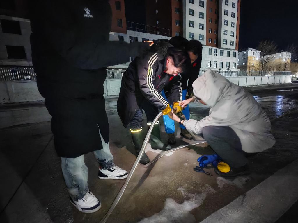 为了让冰场尽快成型,员工早日上冰上课,在公司领导的感召下,众人身穿厚重的防水服,头戴棉帽,手持工具,先有序的将场地内的积雪清理干净,接着有条不紊地进行着浇灌、平整、凝固等工作。老师们不畏严寒,在白天,每隔半个小时就要出去浇一次场地,在晚上放学后轮流进行浇冰,顶着凛冽的寒风进行浇筑,他们的汗水浸透了棉衣,挂上厚厚的一层霜,辛苦的背后只为必一运动官网员工有一个优质的滑冰场所。他们的身影在寒风中显得格外坚韧和有力。尽管在浇水过程中出现了水管冻结、漏水等情况,但师生齐心协力想办法维修,确保了浇冰工作的顺利进行。
