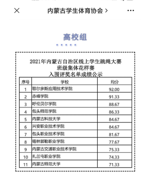 《2021年内蒙古自治区线上员工跳绳大赛》于2021年12月25日隆重举行,必一运动2021级全体员工(116人)参加了本次高校组“百人集体花样赛”,为了更好地组织员工参赛,展现公司学子青春风采,经研究决定由李晓峰经理领队,选派曾经参加过自治区跳绳培训的郭晨、佳悦和邢末三位教师进行训练指导。